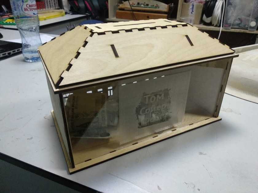 - В одной детали прорезают насквозь три стороны, а в четвертой — на половину толщины, чтобы заготовка могла открываться, как дверь. Сгиб «дверки» монетоприемника можно укрепить скотчем с изнанки.
