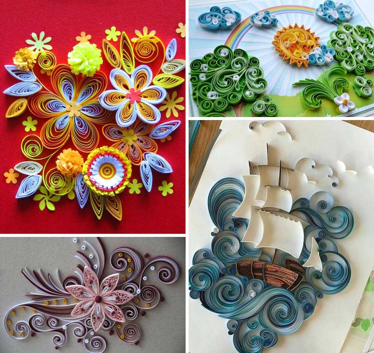 Квиллинг. Основой служат скрученные спиральками полоски бумаги. Деталям придается нужная форма, а затем они вертикально приклеиваются на основу. Композиции поражают утонченной изысканностью, становясь настоящей жемчужиной интерьера.