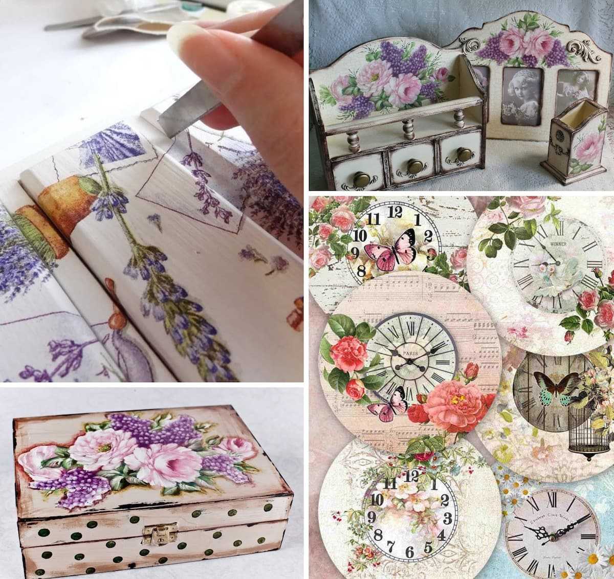 Декупаж. Особенность данной разновидности декоративного творчества заключается в наклеивании на подготовленные окрашенные поверхности орнаментов, картинок, интересных узоров, выкроенных из тонкой бумаги. Часто используют верхний слой салфеток. После финального нанесения нескольких слоев лака создается целостный декор. В этой технике оформляют не только вазы, но и мебель.