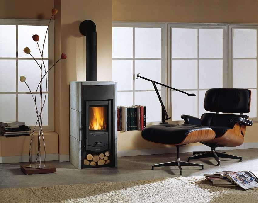 Такой прибор обогревает с помощью дров, пеллет или торфа, плотно уложенных внутри топки.