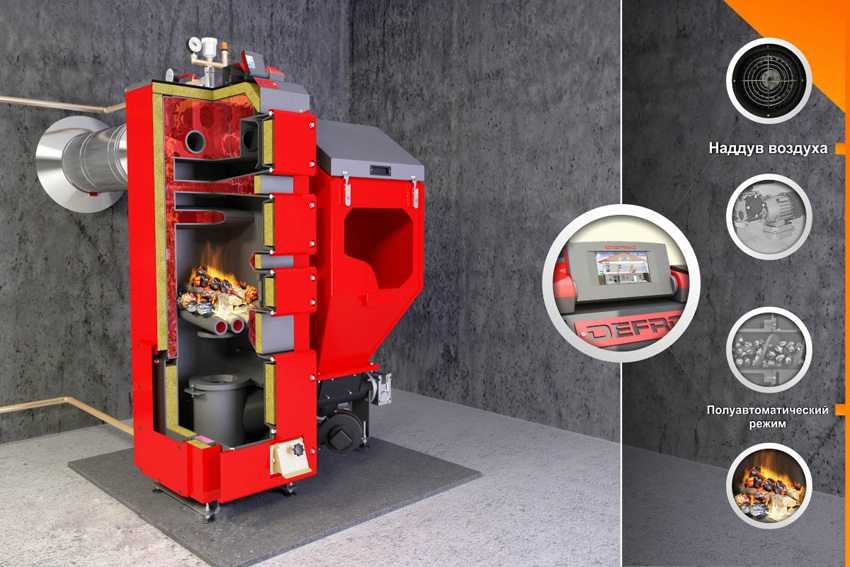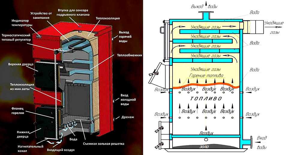 Схема работы таких котлов основывается на особенности твердого топлива тлеть несколько часов, производя при этом большое количество тепловой энергии. Характерно, что топливо в таком случае сжигается более полно, а количество отходов, как следствие, заметно снижается.