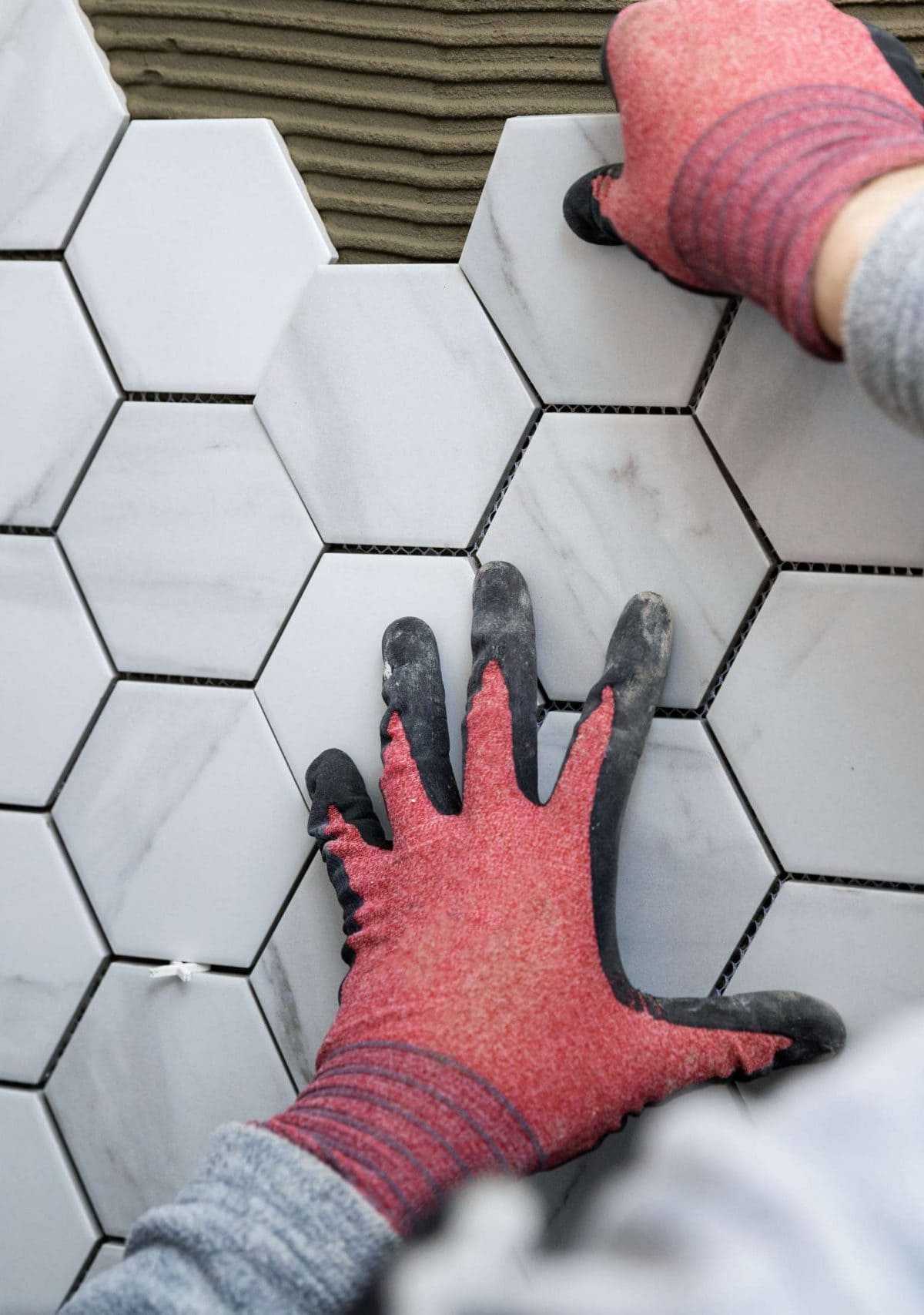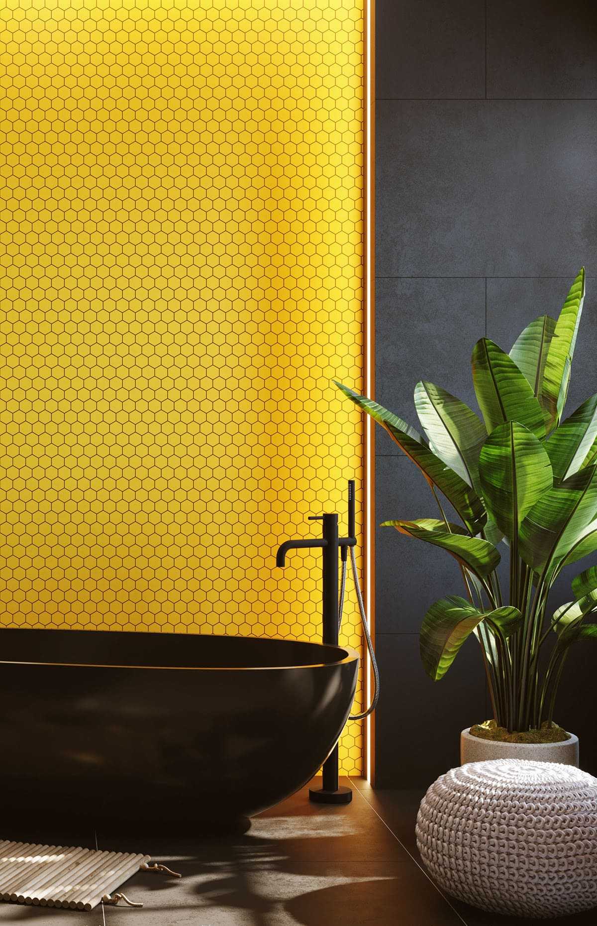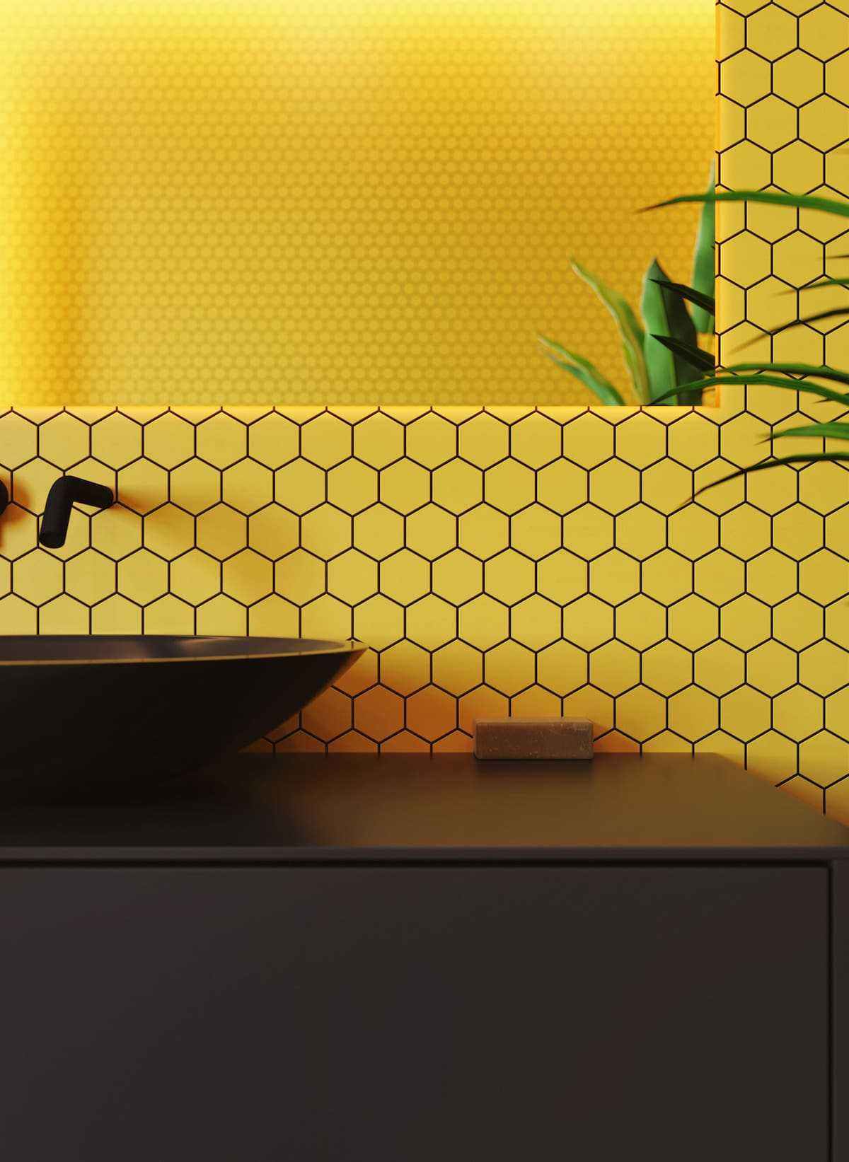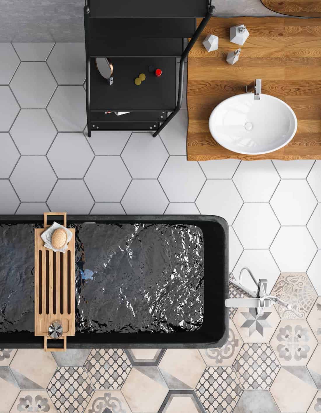 Используя одноцветную шестиугольную плитку, напоминающую соты, мы можем создать классическую композицию. Для дизайнерских интерьеров можно применить плитку с различной структурой, обогащенную графическими геометрическими узорами, которая отлично сочетается с плиткой под дерево.