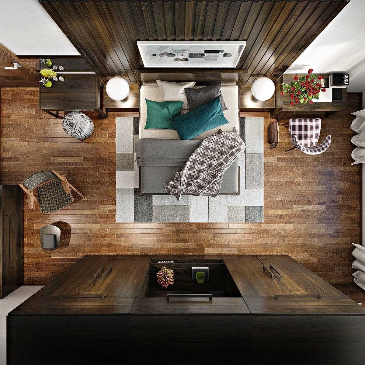 Кровать должна располагаться по возможности в центре комнаты, чтобы остальная мебель располагалась вокруг нее. Так образуется некое подобие острова и к кровати можно подойти с любой стороны. Цвета не должны быть слишком яркими. Прямые линии и гладкие конструкции — это то, что нужно для модного и стильного дизайна.