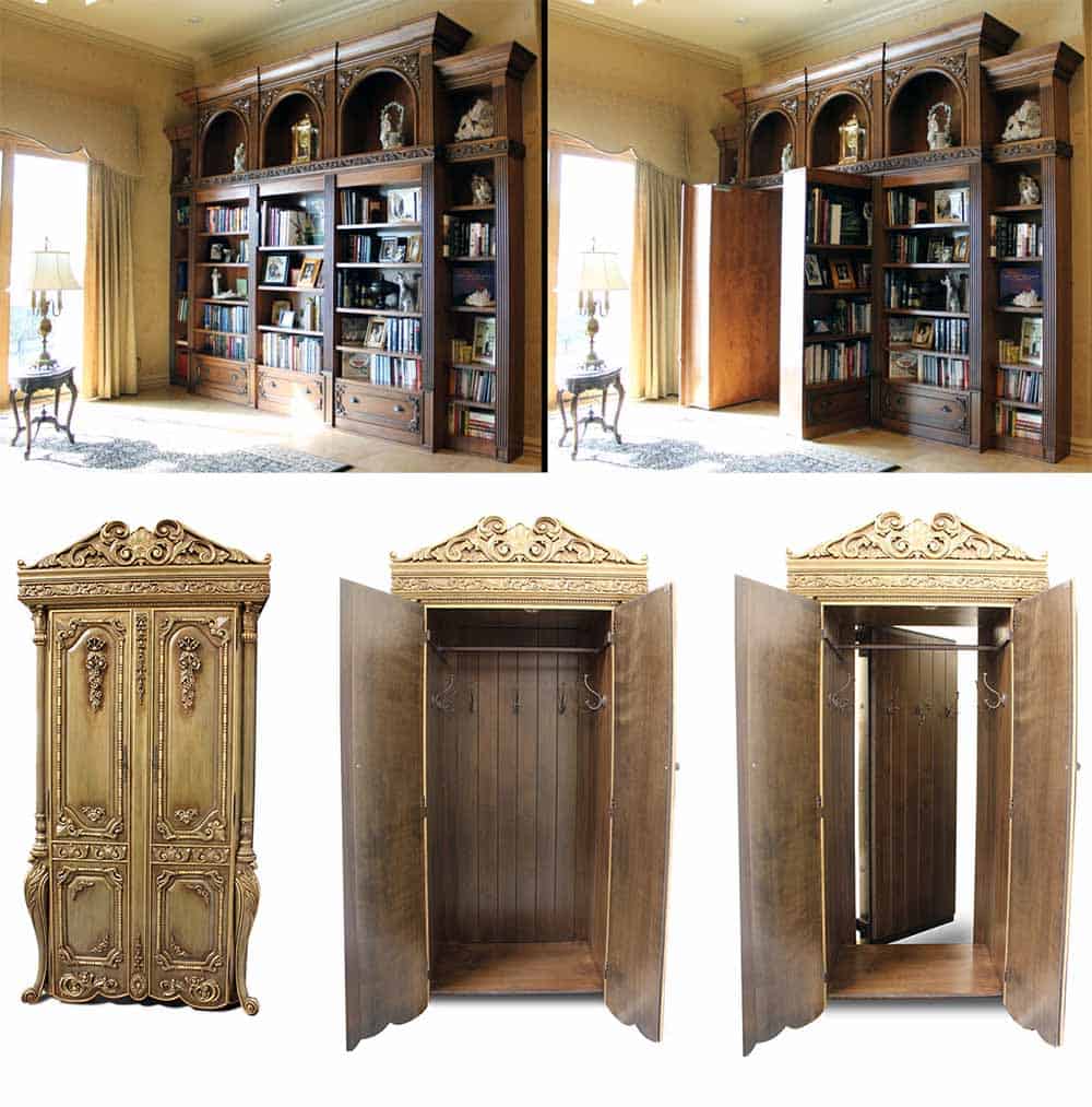 Шкаф за шкафом – звучит, как в сказке? Так, пора воплощать сказку в жизнь! Предлагаем два варианта. Оба – распашные. Можно встроить шкаф за дверями, замаскированными под секции обычного книжного шкафа. А если нужна еще более креативная идея, расположите дверь за корпусным шкафом без задней стенки. Для надлежащего антуража лучше подойдет старинный корпусный шкаф.