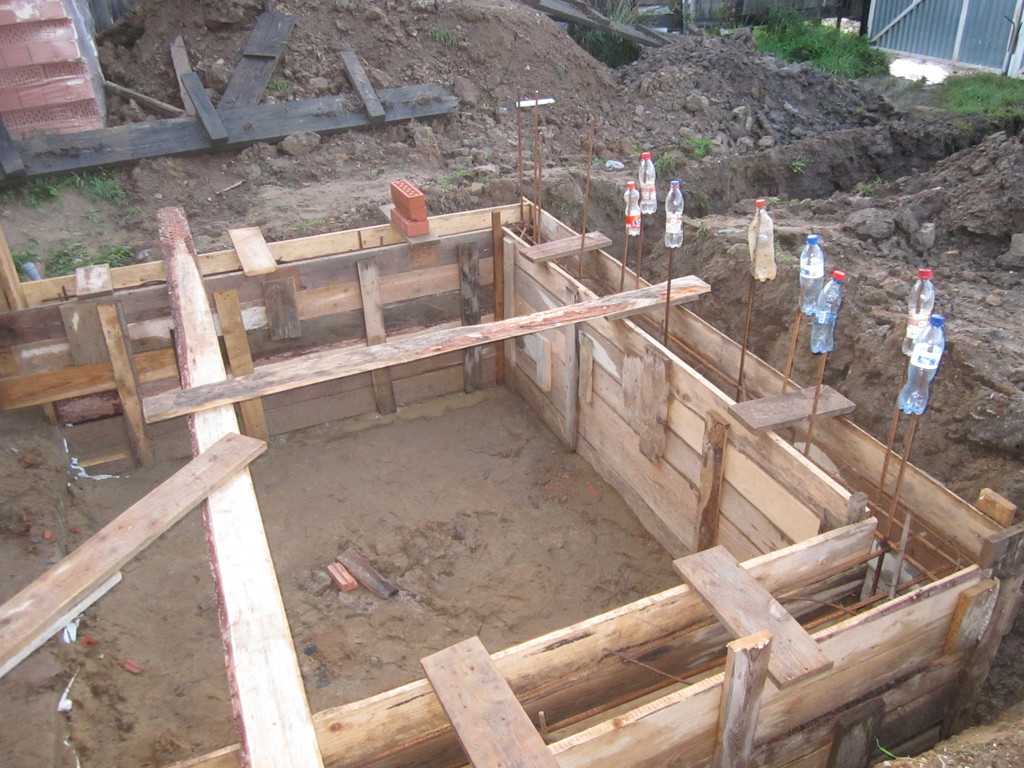 По разметке копается котлован на глубину залегания фундамента дома. Далее в него устанавливается опалубка. После этого насыпается песчаная «подушка» (10см) и укладывается щебень (слоем в 5см). Затем заливается пятисантиметровый слой бетона. Через сутки устанавливается арматурный каркас. Далее заливается собственно фундамент.