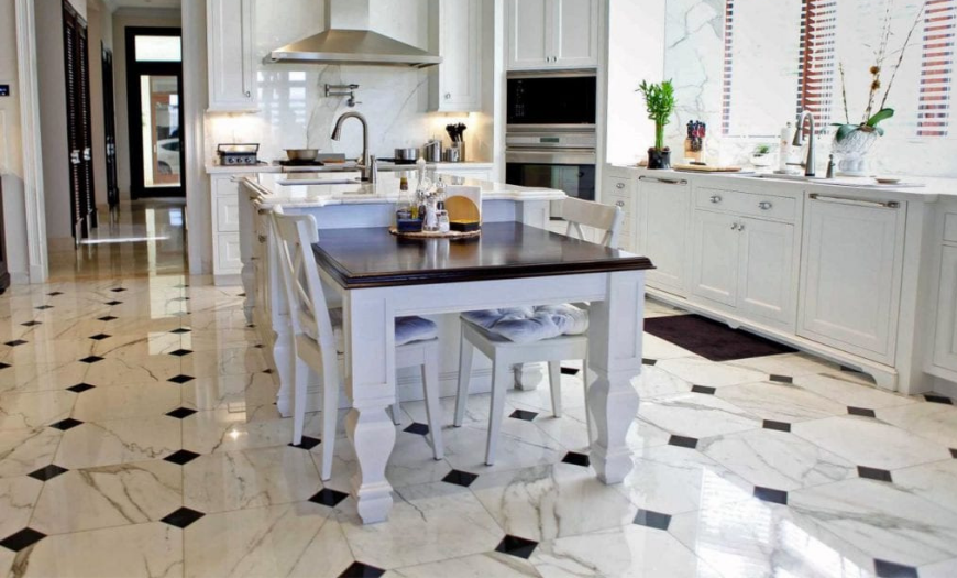 На полу красиво смотрится бело-черная плитка в виде шахматной клетки. Если помещение большое и совмещено со столовой, то используют наливные глянцевые варианты. Кухонный фартук выполняют как контрастным темным, так и в тон основного фона.
