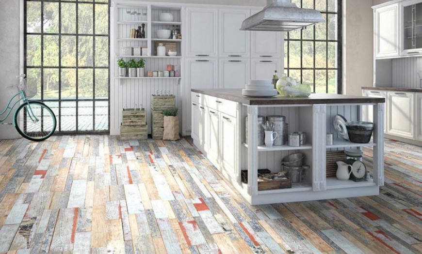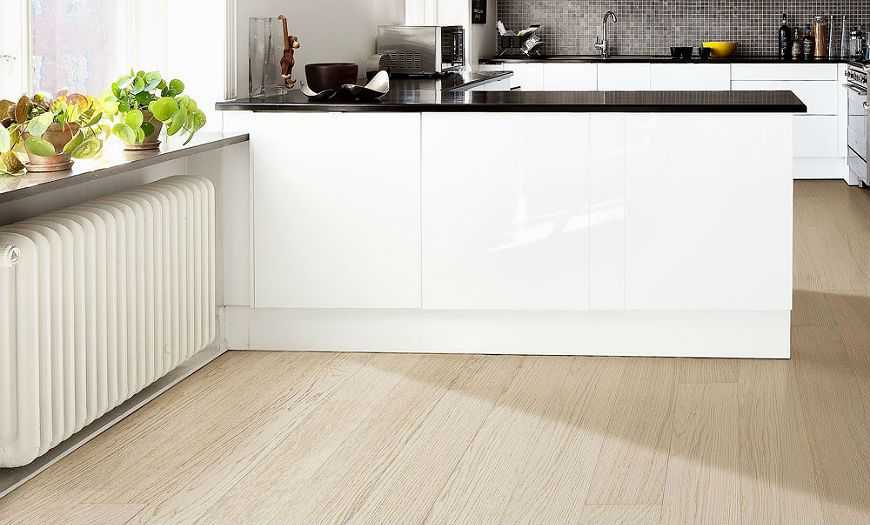 Для кухонного пола идеально подойдет белая плитка или керамогранит, который можно совместить с ламинатом под выбеленное дерево в обеденной зоне
