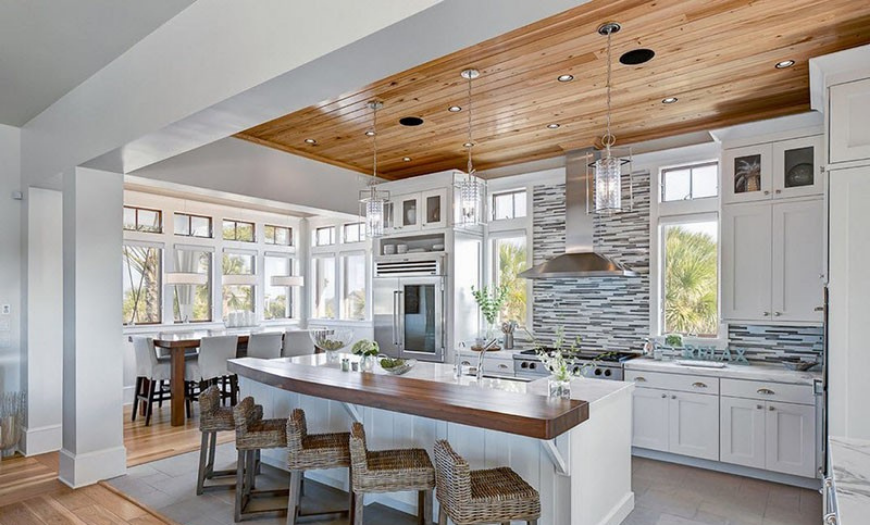 Еще недавно самыми распространенными вариантами отделки потолка на кухне были штукатурка и окраска, побелка. Сейчас все чаще выбирают натяжные потолки. Это практичный и долговечный вариант. Полотно быстро устанавливают. Можно выбрать глянцевое или матовое покрытие, практически любой цвет.