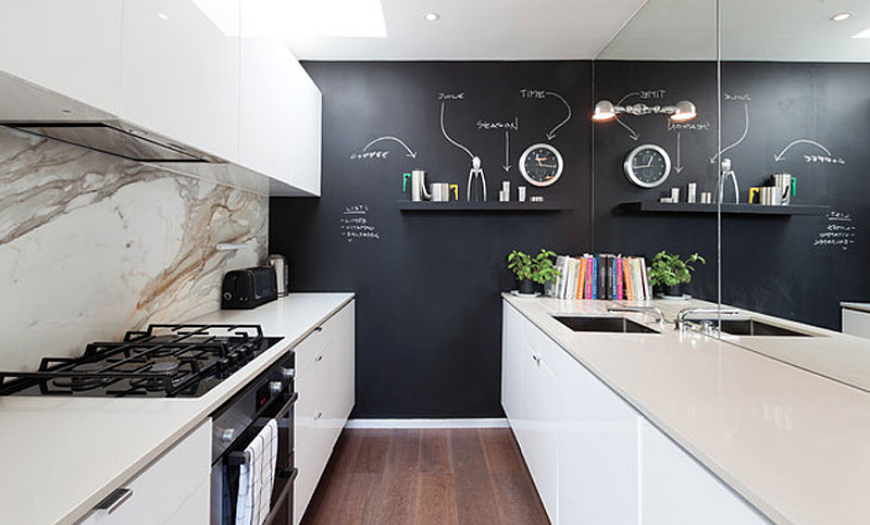 Помещение для приготовления пищи – это изолированное пространство, которое можно оформлять в любом стиле. Чтобы интерьер жилья выглядел единым целым, детали общей композиции повторяются в кухне с темной столешницей. Монохромный дизайн красиво смотрится в нескольких направлениях.