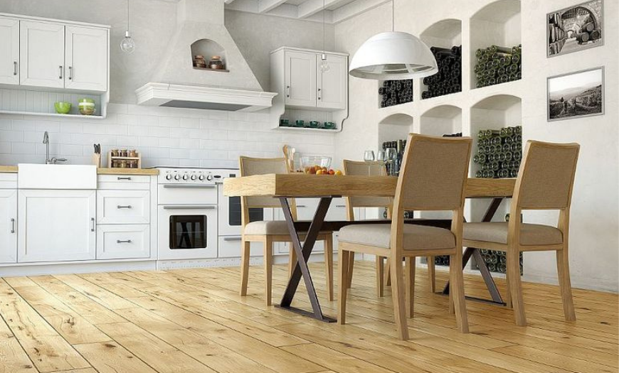 Если кухня объединена с гостиной, то наилучшим вариантом будет паркетная доска или ламинат. Натуральные деревянные полы теплые, эстетически привлекательные. Ламинат прохладный, но имеет большую прочность, дешевле, относительно влагоустойчив.