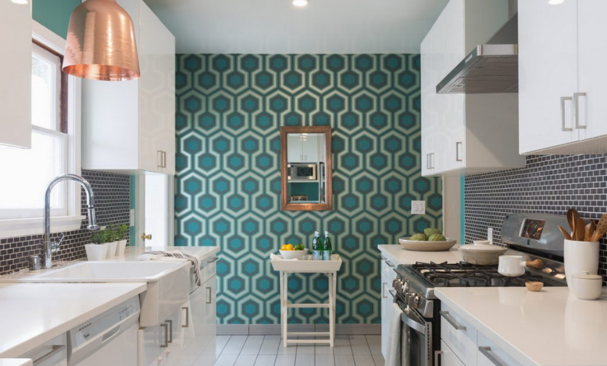 Белые обои – не лучший выбор для кухни, даже если это моющийся винил или флизелин. Оформи рабочую зону плиткой, а для остальных стен возьми моющуюся белую краску. С нее легко снять жир и грязь, а если не удастся отмыть какое-то пятно – достаточно просто незаметно закрасить поверх.