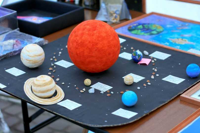Наглядно изобразить Солнечную систему технически не сложно: подобрать темный фон, начертить с помощью циркуля восемь орбит, прикрепить планеты из пластилина или пластика, бумаги. Вряд ли удастся в точности отразить на листе соотношение в расстоянии между Солнцем и планетами, но показать относительные размеры всех объектов необходимо (Юпитер – самая большая планета, Меркурий – самая маленькая). Подбирая цвета, учесть, что Марс – красный, Земля и Венера – голубые, жаркий Меркурий можно покрасить ярко-оранжевым. Хорошо выполненный макет космоса достойно войдет в фонд учебных пособий школы.