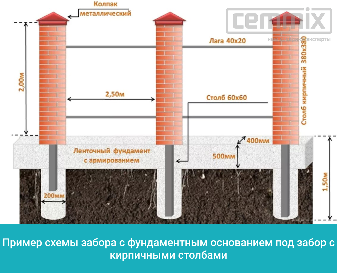 - Ленточное основание подходит для ограждений высотой до 2 м и толщиной в 0,5 кирпича.