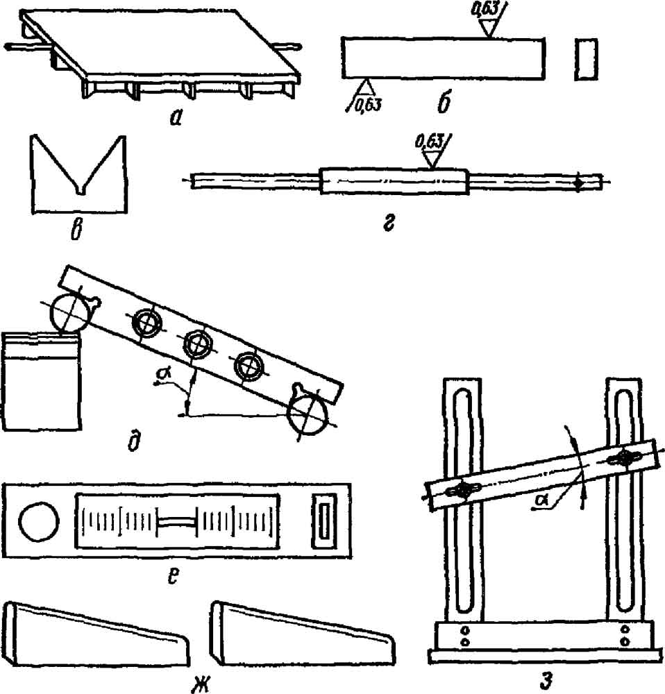 Измерительные вспомогательные приспособления: а — плита для измерений; б — мерительная линейка; в — призма; г — мерительная скалка; д — синусная линейка; е — уровень; ж — мерительная стойка; з — клинья для измерения отверстий.