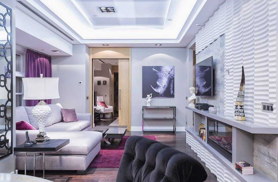 Большие гостиные предоставляют возможность установки двух осветительных приборов на потолке. Расчет диаметра каждой производится по формуле, описанной выше. Общая площадь делится на 2 сектора, где по центру каждого предполагается установить источники света. Поэтому они могут отличаться по своему диаметру, но стилистическое оформление все же стоит оставить одинаковым. Нелепо будут смотреться светильники в одном помещении, выполненные в разных направлениях.