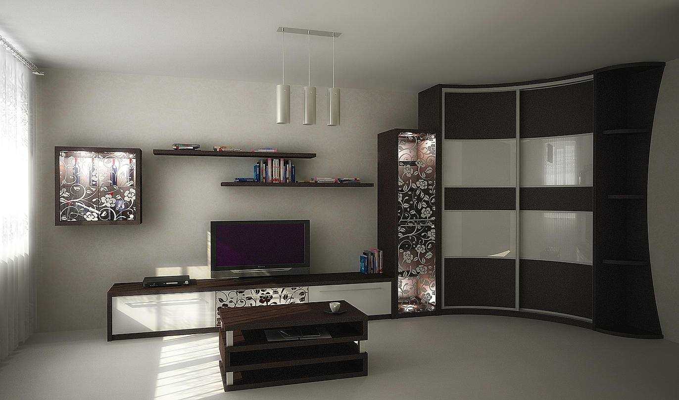 - Шкаф-купе в гостиной. Моделью предусмотрена одна дверца на подвижном ролике, который вращается по встроенному пазу. Весьма удобный тип мебельного оформления. Производственный вариант часто снабжен зеркальными панелями на фасадах.