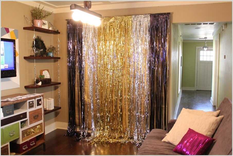 Вариант украшения комнаты дождиком и мишурой позволит вам создать настоящую зимнюю сказку. По сути – это универсальный декор, без которого невозможно себе представить ни один Новый год. Его принято развешивать на занавесках и крепить к стене в виде ёлочного силуэта и прочих фигур. Таким декором можно красиво оформить люстру или дверной проём, дополнить убранство ёлки, украсить бокалы, мебель и другие предметы в интерьере. Дождик можно совместить с огоньками гирлянд и новогодними композициями, использовать как основной декор либо в качестве блестящего акцента. Проявите фантазию и у вас всё получится!