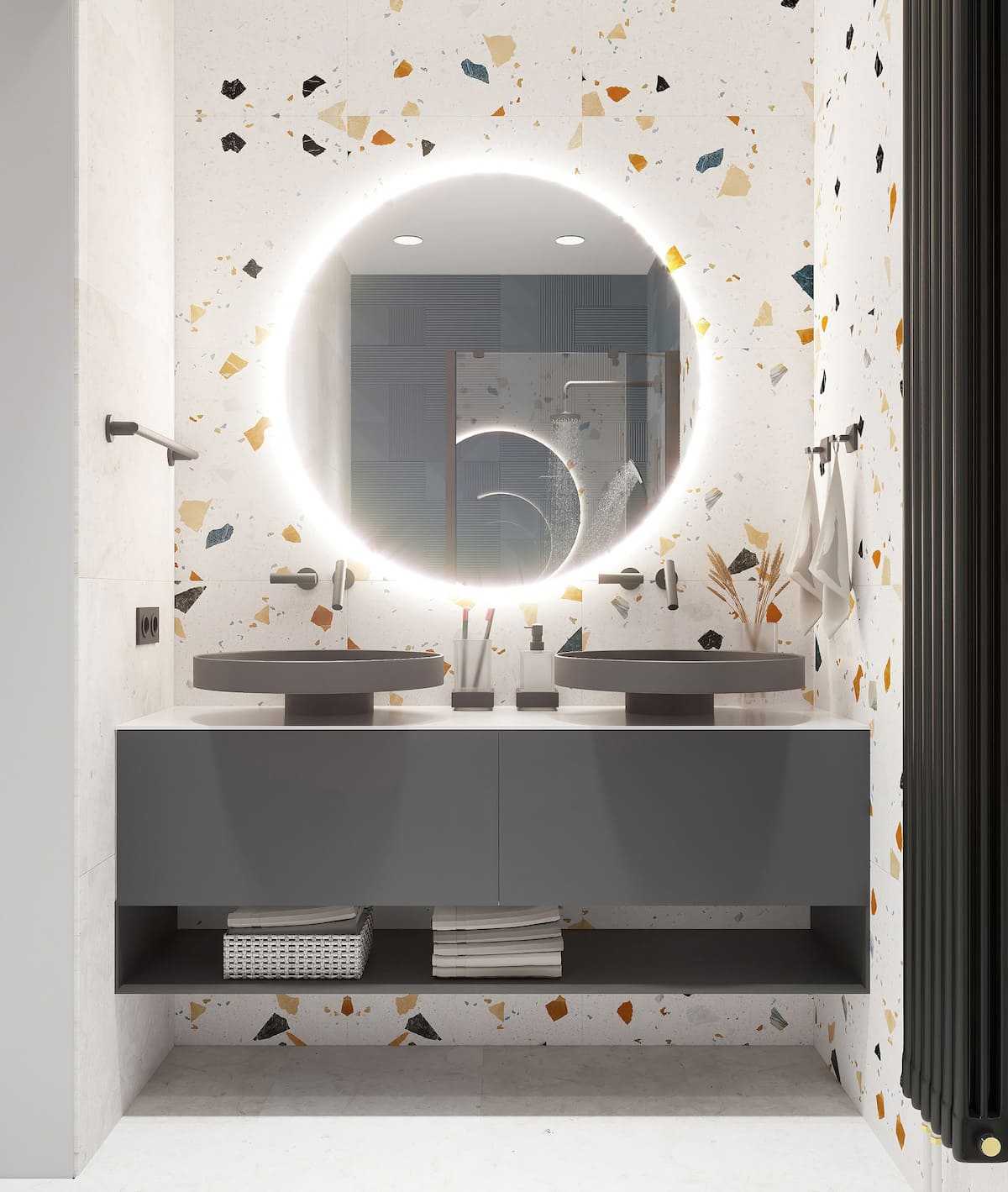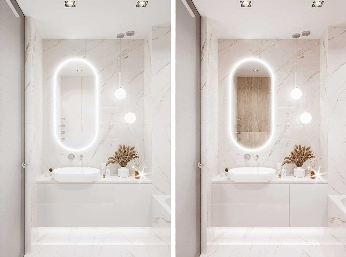 Для маленькой ванной 2022 стоит выбрать настенный зеркальный светильник с минималистичным дизайном. Настенный светильник продолговатой формы с цветом света 3000К будет выглядеть чрезвычайно элегантно, не слепит и не отбрасывает тени. Он дает луч света, который точно и равномерно освещает лицо.