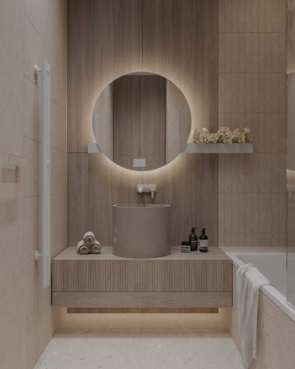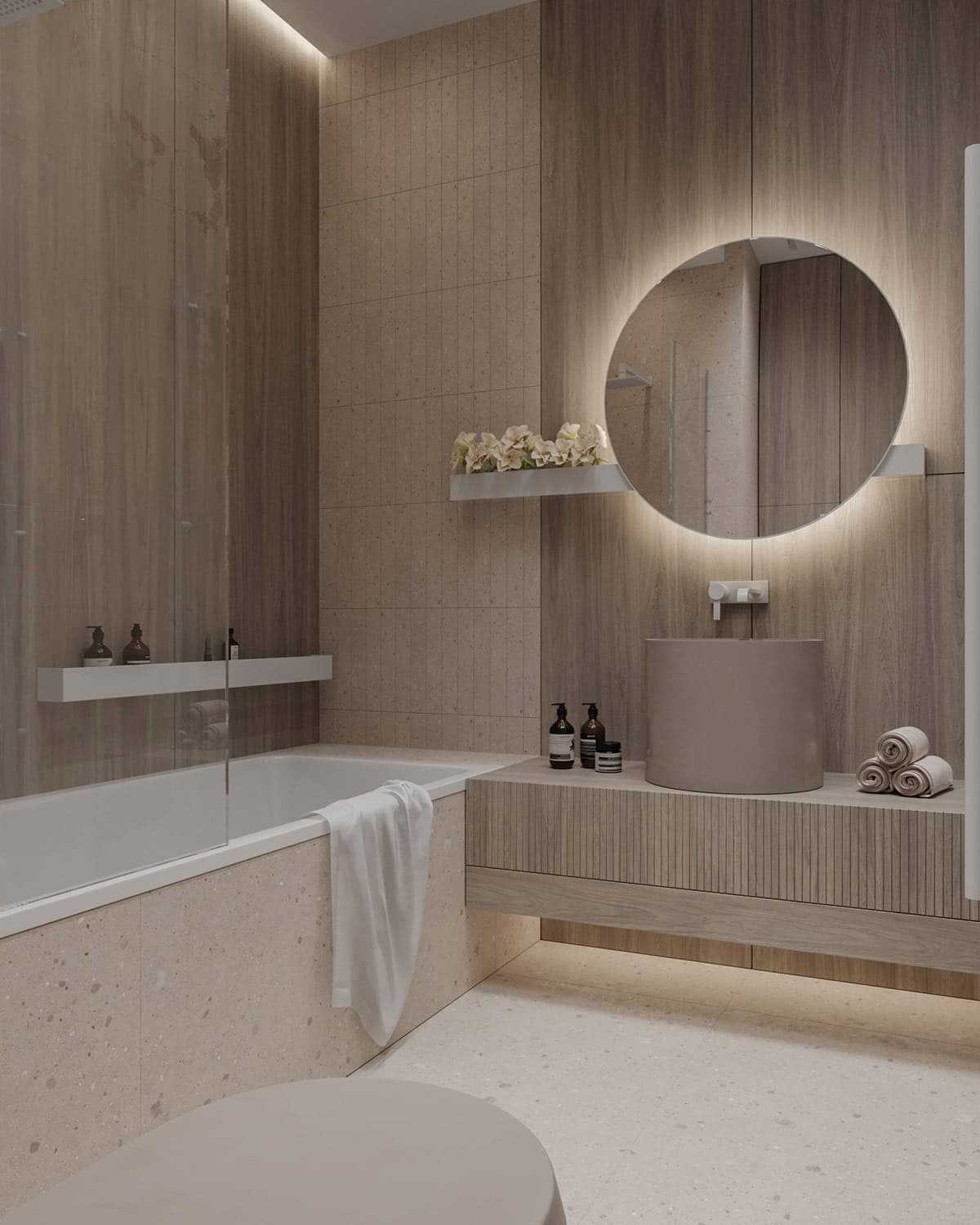 Также стоит осветить полки в ванной светодиодными лентами. Благодаря им у вас есть возможность в кратчайшие сроки найти самое необходимое. Такие минималистичные световые акценты создают приятную атмосферу в небольшом пространстве ванной комнаты и положительно влияют на ваше самочувствие.