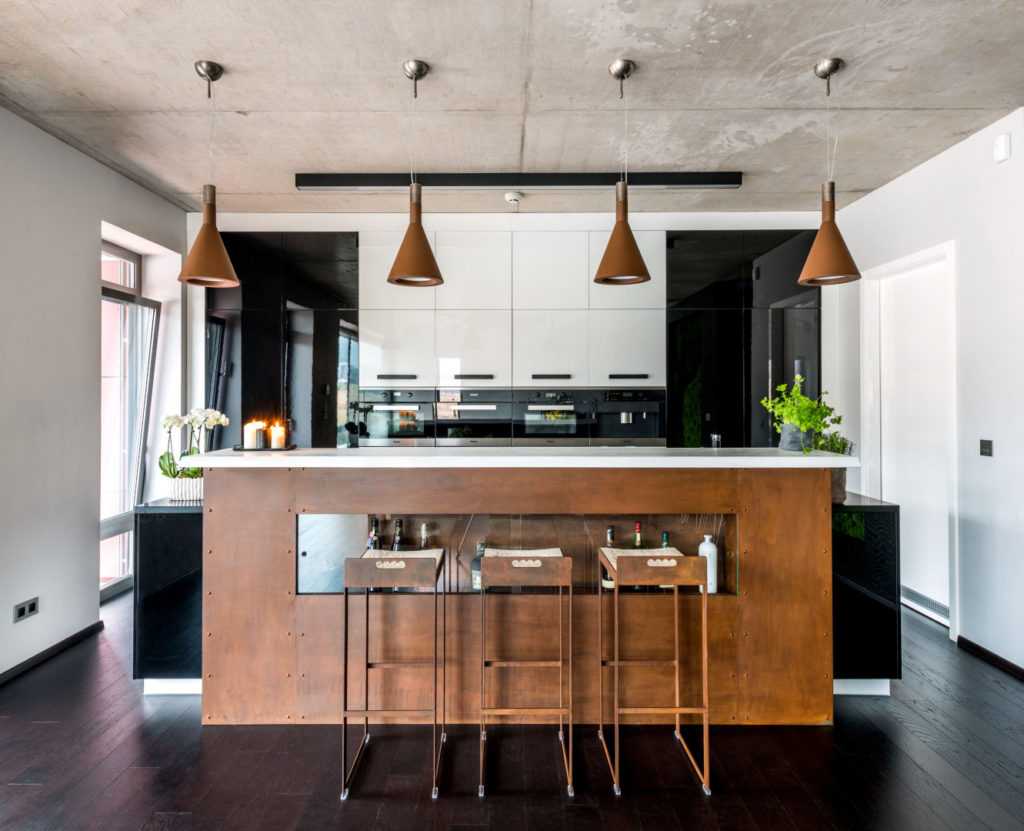 Современный, с его сугубой функциональностью и технологичностью – серо- или черно-белые оттенки гаммы, с грилем и фритюрницей, вытяжкой, посудомойкой и шкафом для подогрева посуды, выполненными в металле или близких по тонам материалах.