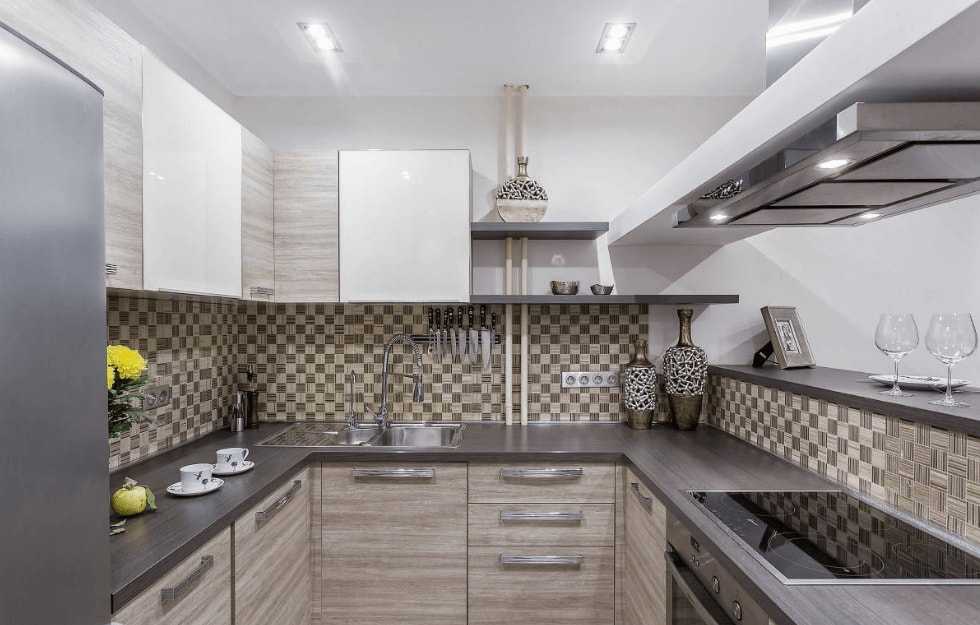 Оригинально выглядит кухня, в которой частично используется зеркальная плитка для декора стен. В этом случае происходит эффектное и визуальное расширение пространства. Актуально применение дизайна с глянцевой плиткой, украшают которую с помощью геометрических мотивов.