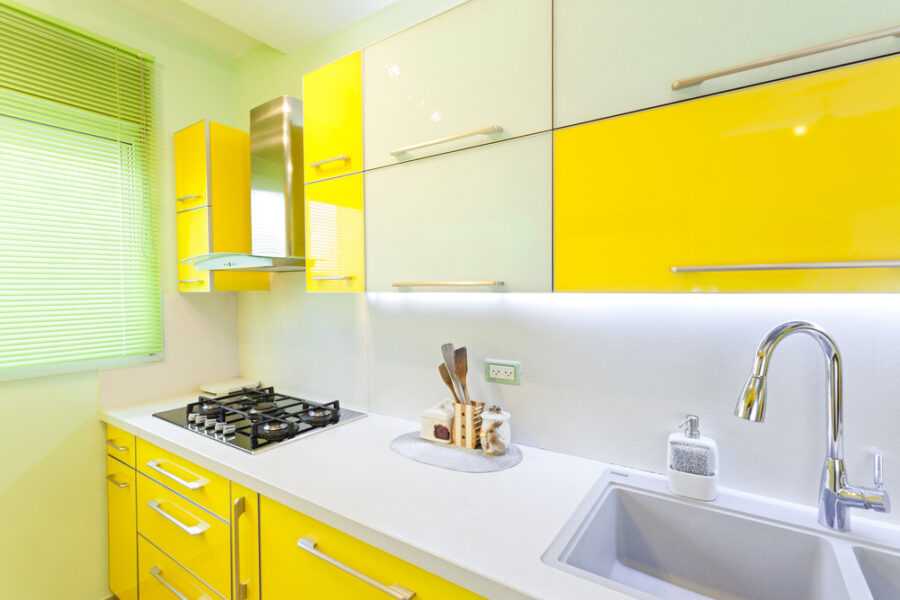 Есть три варианта на выбор: модные индивидуальные геометрические украшения желтого цвета, например, полосы или круги, расположенные на одной стене, одна стена, окрашенная в насыщенный цвет, или вся кухня, покрытая желтой краской или обоями.