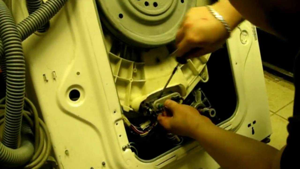 - Открутить винты, которые крепят заднюю стенку, и снять ее. На этом этапе можно обнаружить мягкие объекты — например, бумагу, пояс или носок. Оказавшись за пределами барабана, они наматываются на ТЭН. Но на этом останавливаться не стоит, ведь если вы услышали шум, нужно искать твердое тело, которое могло его издавать. Поэтому двигаемся дальше.