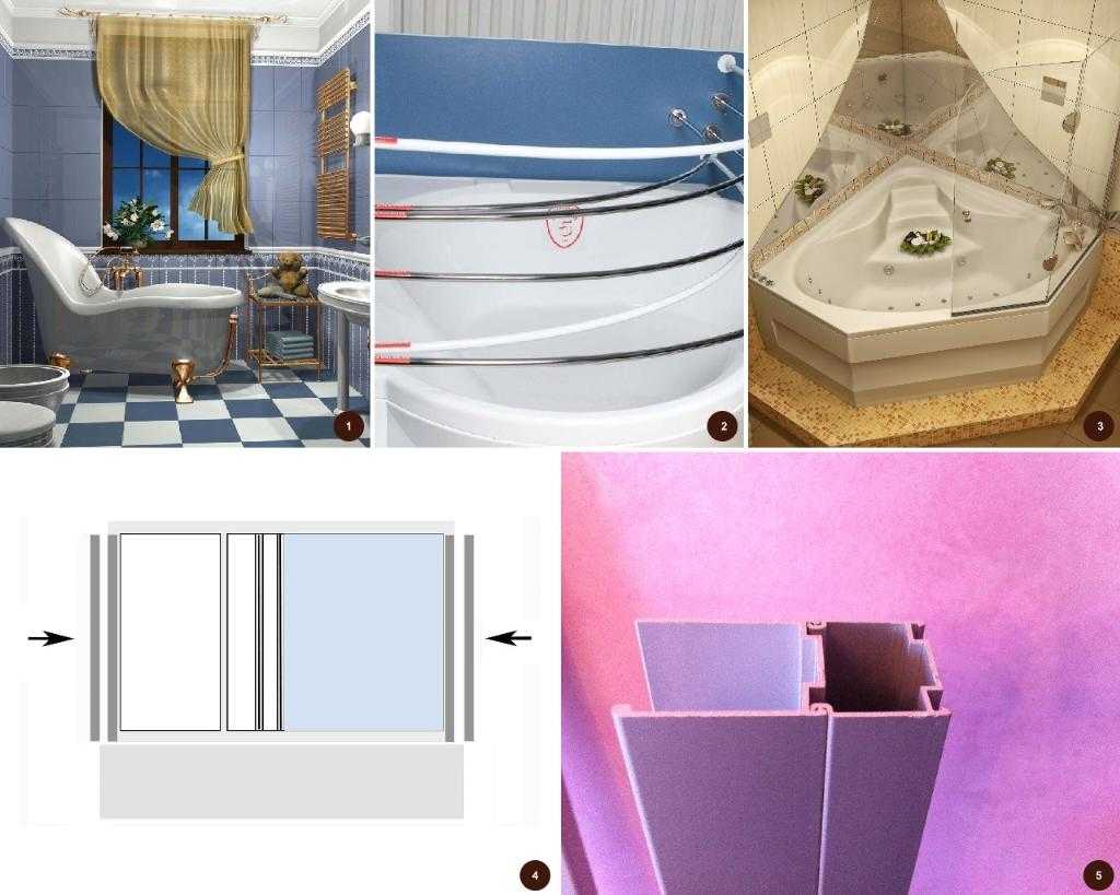 Разумеется, с ваннами стандартных размеров у вас будет меньше хлопот при подборе штанги. Вы сможете остановить свой выбор на любой понравившейся модели, будь то прямой, угловой или изогнутый карниз. Нестандартная конфигурация потребует большей изобретательности и усилий при подборе и монтаже. Как правило, универсальные модели, представленные в ассортименте специализированных магазинов, едва ли могут удовлетворить какие-либо нестандартные потребности, поэтому в такой ситуации придется прибегнуть к изготовлению карниза по индивидуальному заказу.