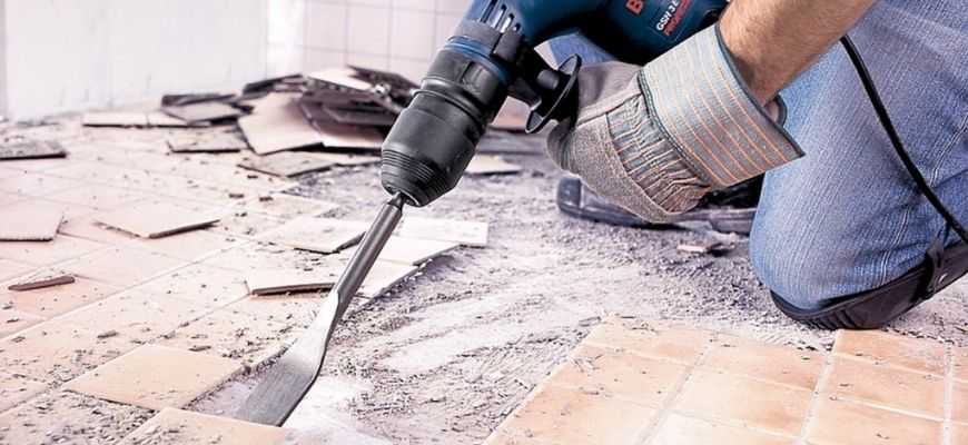- Для демонтажа. Прежде чем устраивать новое покрытие, необходимо избавиться от старого. Для этого могут понадобиться перфоратор, шпатели, зубило, молоток и т.д.