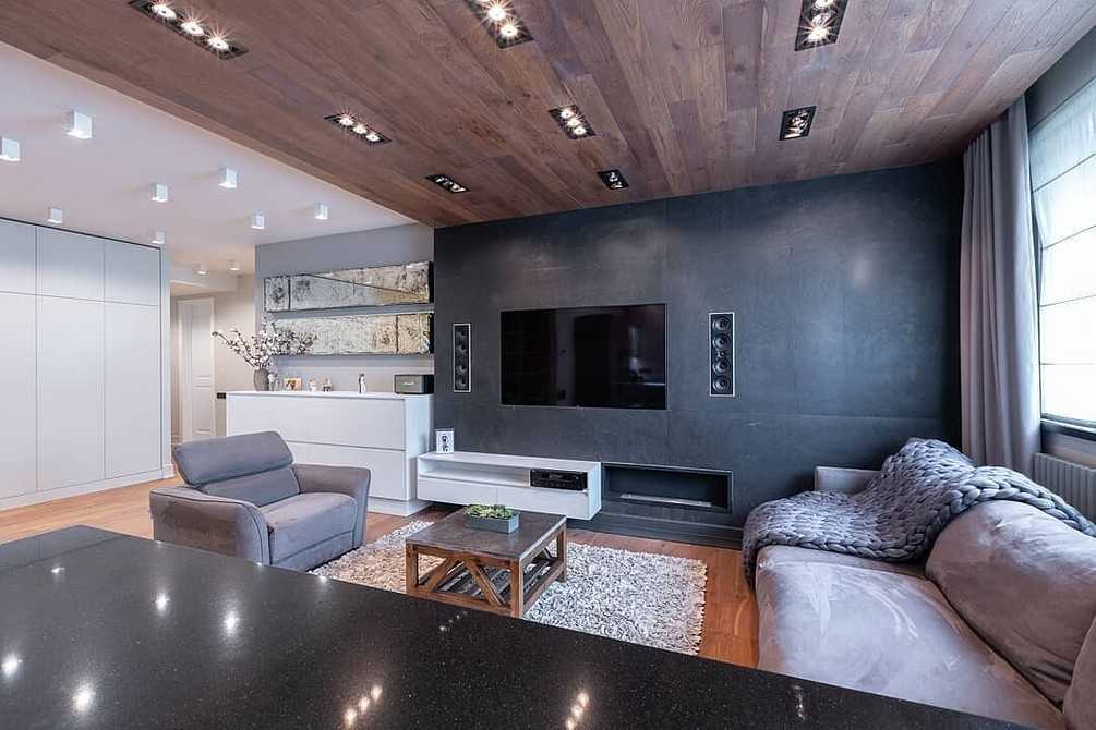Когда подходящее место найдено — как правило, это одна из стен — то там можно устроить подвесную нишу для телевизора из гипсокартона или дерева. Дизайн может быть разным: в виде изящной рамы или современного стеллажа, внутри которых красиво будут смотреться полки для книг и предметы декора.