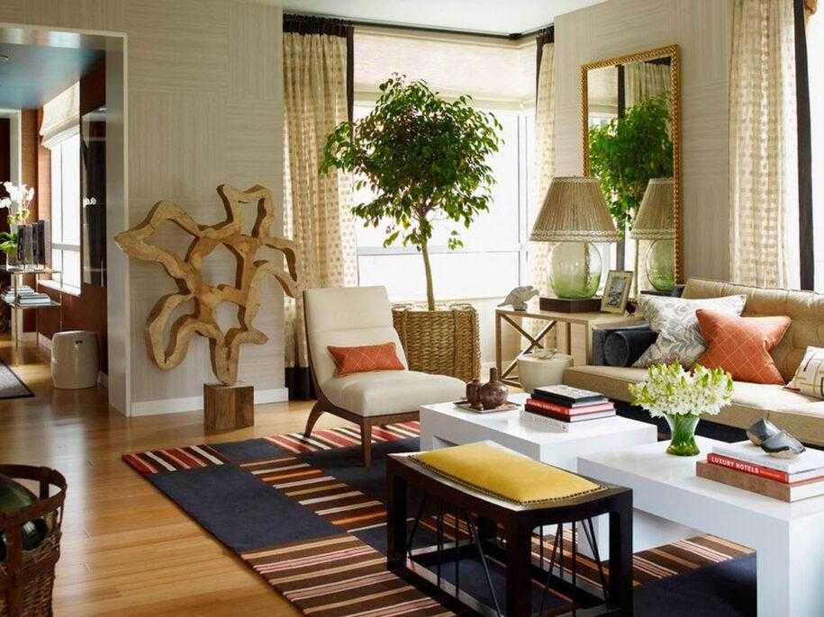 Размещение на полу в гостиной комнате ковра визуально разделит помещение на разные функциональные зоны. Также можно выбрать два ковра с различным рисунком и украсить ими гостиную комнату и спальню. Модный тренд — наслаивание ковров друг на друга.