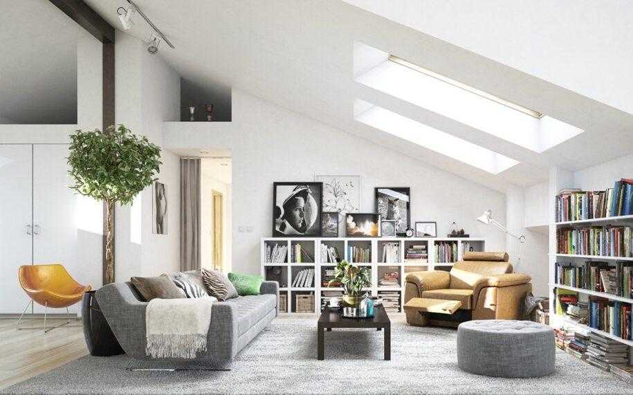 Стеллажами для книг или одежды можно разделить помещение на зоны, сэкономив при этом пространство. Такой вид перегородок может иметь различную высоту. Невысокие полки отделяют спальню от зала частично, стеллажи высотой до потолка полностью разделяют функциональные зоны.