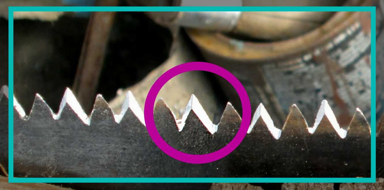 - При детальном осмотре видно, что кончики зубьев становятся округлёнными, что может привести к травмированию из-за тугого хода полотна и возможности его отскока при прикладывании больших усилий.