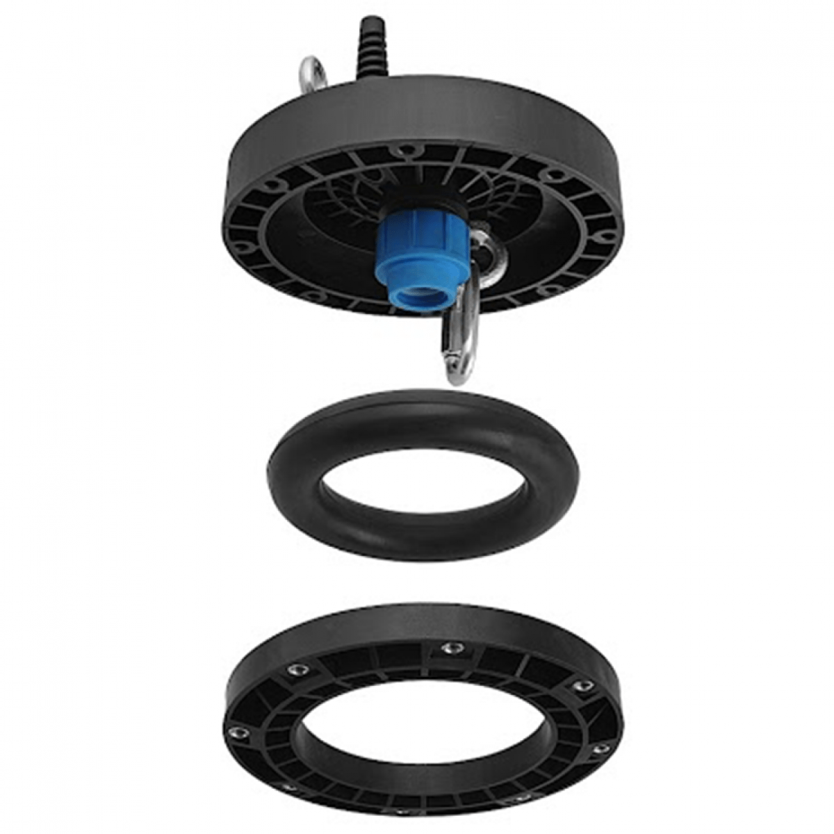 - Крышка. Верхняя часть конструкции, при установке прижимается к фланцу через эластичный уплотнитель. Отверстия крышки предназначены для пропуска кабеля питания и трубы/шланга для подачи воды. В нижней части располагается карабин с болтовым креплением — к нему на тросе подвешивают насос.