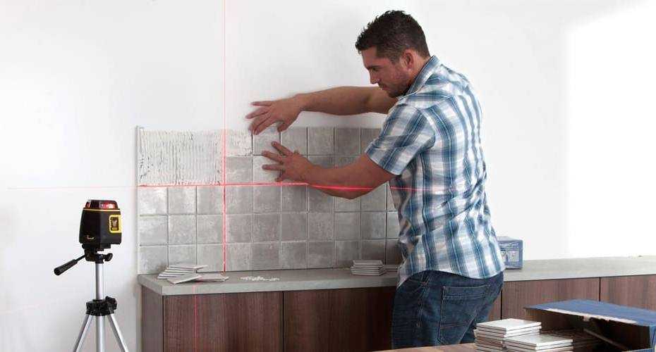 Это устройство также применяется опытными мастерами во время плиточной кладки. С его помощью гораздо проще выдерживать ровные линии, чем и обуславливается спрос на данное приспособление в строительной среде. Однако стоит сказать, что для облицовки рабочей поверхности плиткой понадобится инструмент, который рассекает луч на отдельные перпендикулярные пучки.