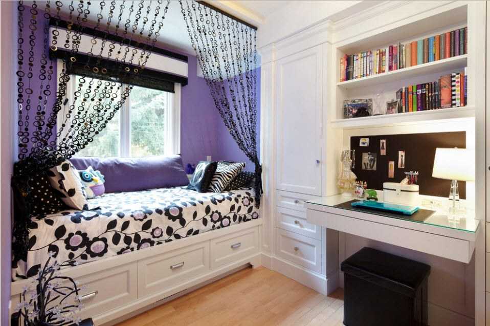 Вместо перегородки может быть задействован стеллаж между диваном и кроватьюИсточник berkem.ru