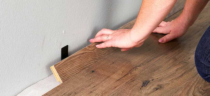 Эти элементы закрепляют дюбелями либо специальной закладной. Монтаж выполняют по инструкции производителя. Исключают плотное прилегание, чтобы не создавать помехи при смещении ламината.