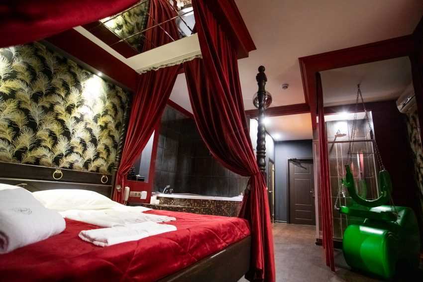 Подобный дизайн подойдет для страстных натур. Но при этом еще на этапе планирования придется тщательно продумать будущий проект. Перебор двух сильных цветов сделают спальню кошмарно-темным и тесным помещением.