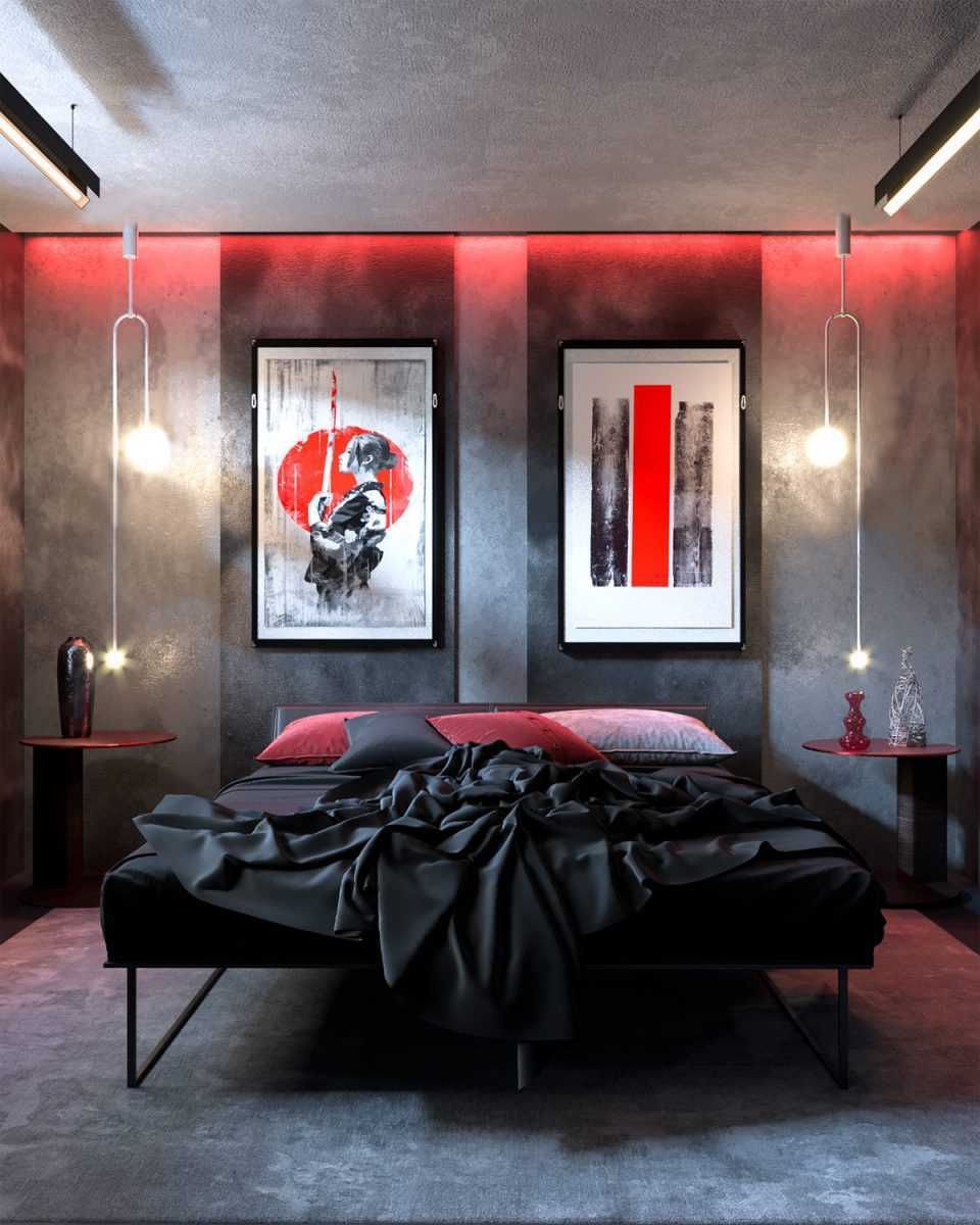 Спальня в темных тонах с преобладанием черного будет неплохо смотреться с красными аксессуарами и светло-древесным полом. Идеально для этого подойдет готическое стилевое решение.
