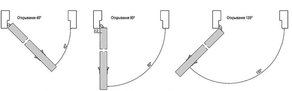 Угловые петли имеют стандартные разновидности, но при необходимости можно сделать на заказ любой другой угол открывания. Основным параметром выбора является расположение шкафа относительно других и имеющееся пространство для его открытия.