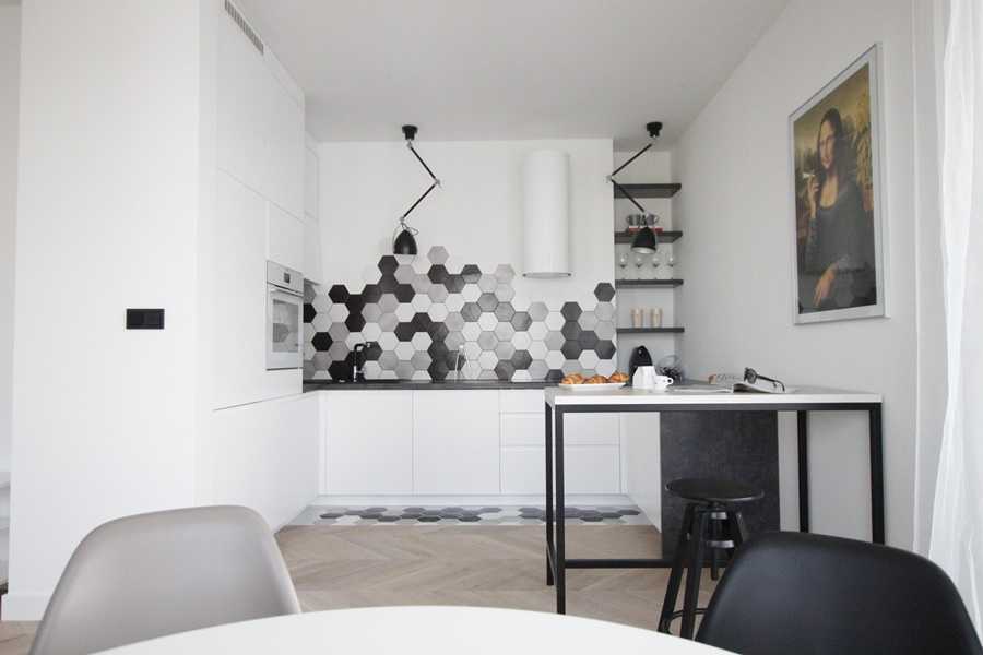 Для черно-белого оформления кухни фартук из плитки может стать характерной, выделяющейся чертой, которая добавит эффекта сочетанию строгих цветов. Яркая плитка внесет ноты жизни в дизайн, разнообразит палитру и добавит жизни всей картине.