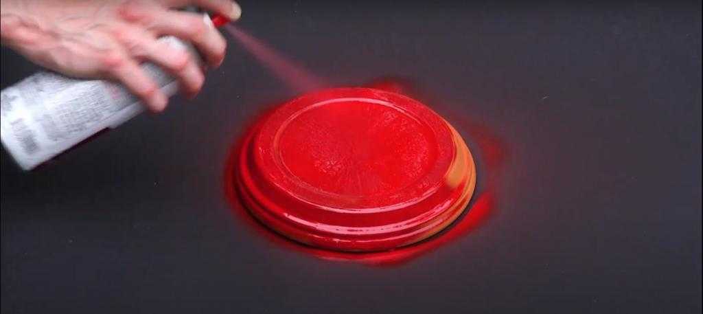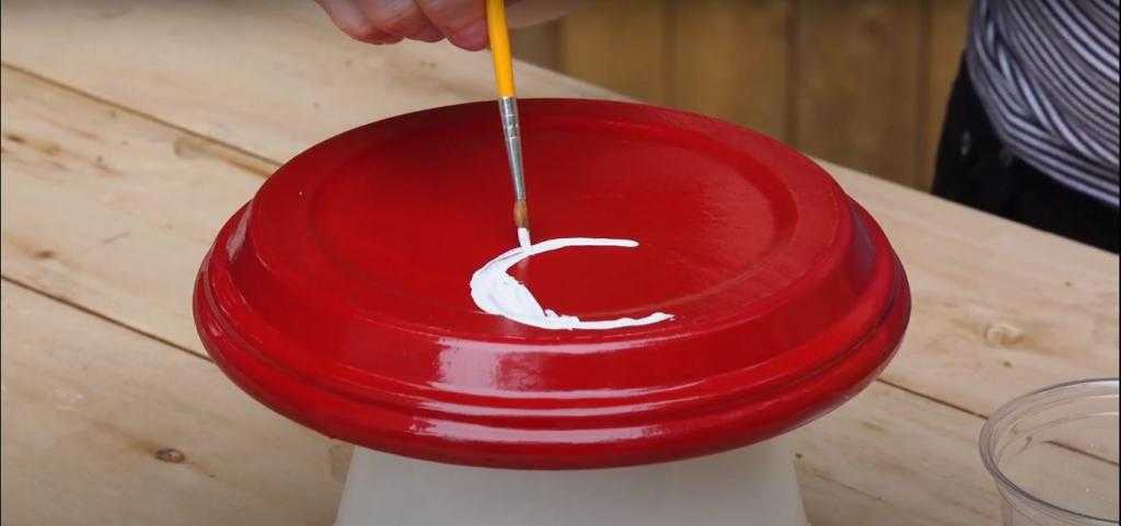 Красной краской покрасьте шляпку и оставьте до полного высыхания. После высыхания нарисуйте белые кружочки в произвольном порядке. Не забудьте покрасить внутреннюю часть шляпки белой краской.