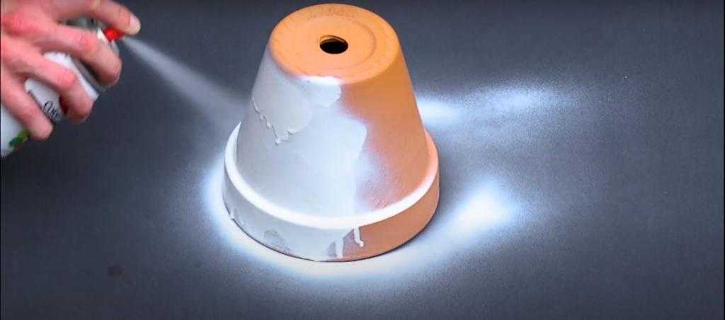 Переверните горшок вверх дном, пройдитесь по его поверхности ветошью, смоченной растворителем. Затем покрасьте горшок белой краской. Эту же работу проделайте с поддоном, только покрасьте его красной краской.