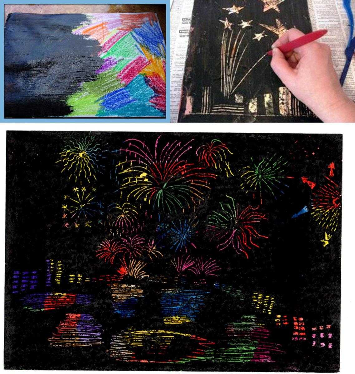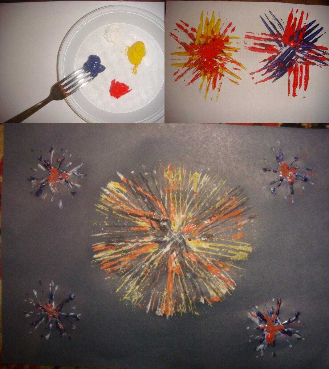 - Салют. Картинку праздничного салюта можно сделать, используя обычные краски, фломастеры, пластилин, цветные ватные шарики и другие материалы.