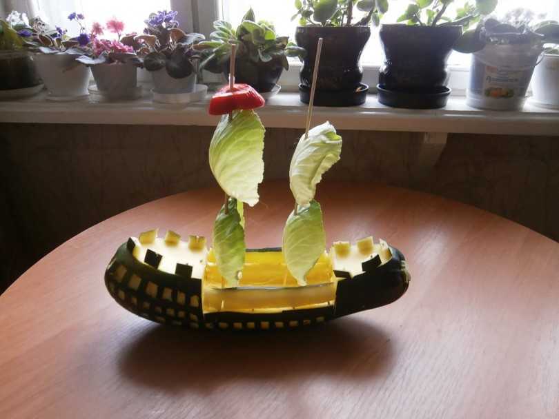 Кабачок разрезают на две части. Одну кладут на синий фон («море») разрезом вверх. В мякоти фиксируют высокие деревянные шампуры («мачты»). Паруса вырезают из бумаги, ткани или выкладывают крупными листьями.