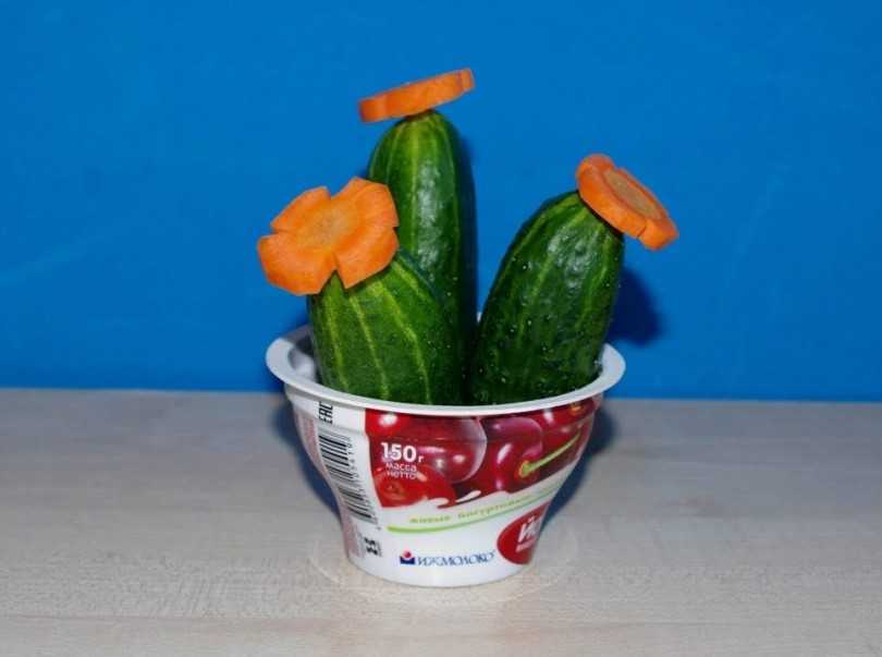 Из огурцов одинакового размера можно получить миниатюрные балетки или тапочки, из тонких огуречных колец — нежные цветы. А кто уверенно чувствует себя в фигурной резке, может попробовать сделать реалистичных усатых раков, используя лишь нож и огурцы.