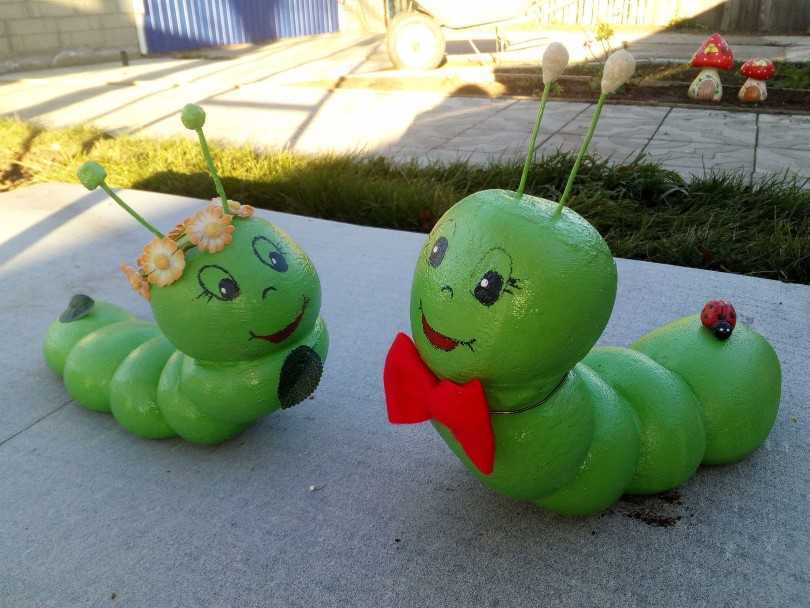 - Соединяют головку и туловище гусеницы. Голова крепится вертикально к ее телу. Поделка готова!