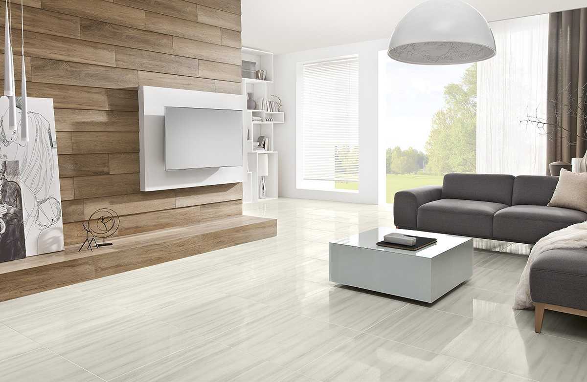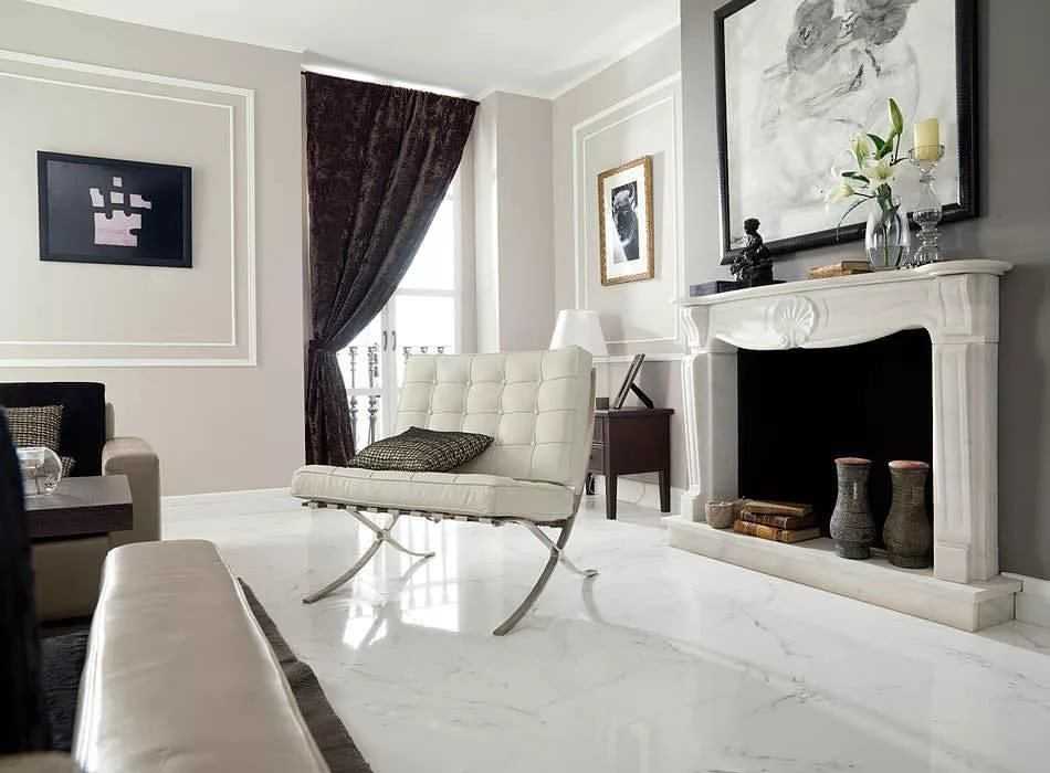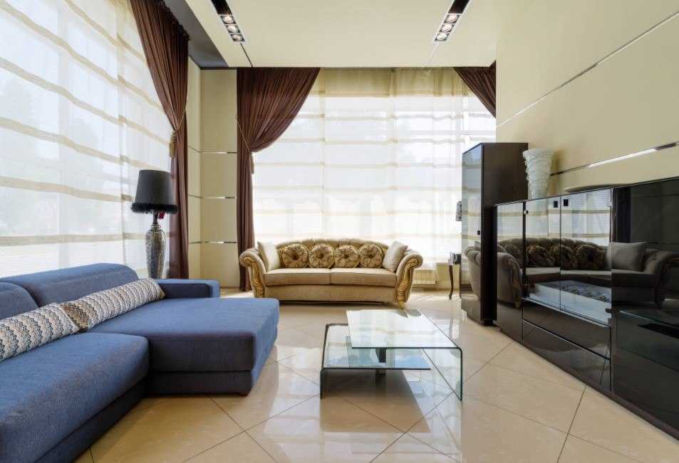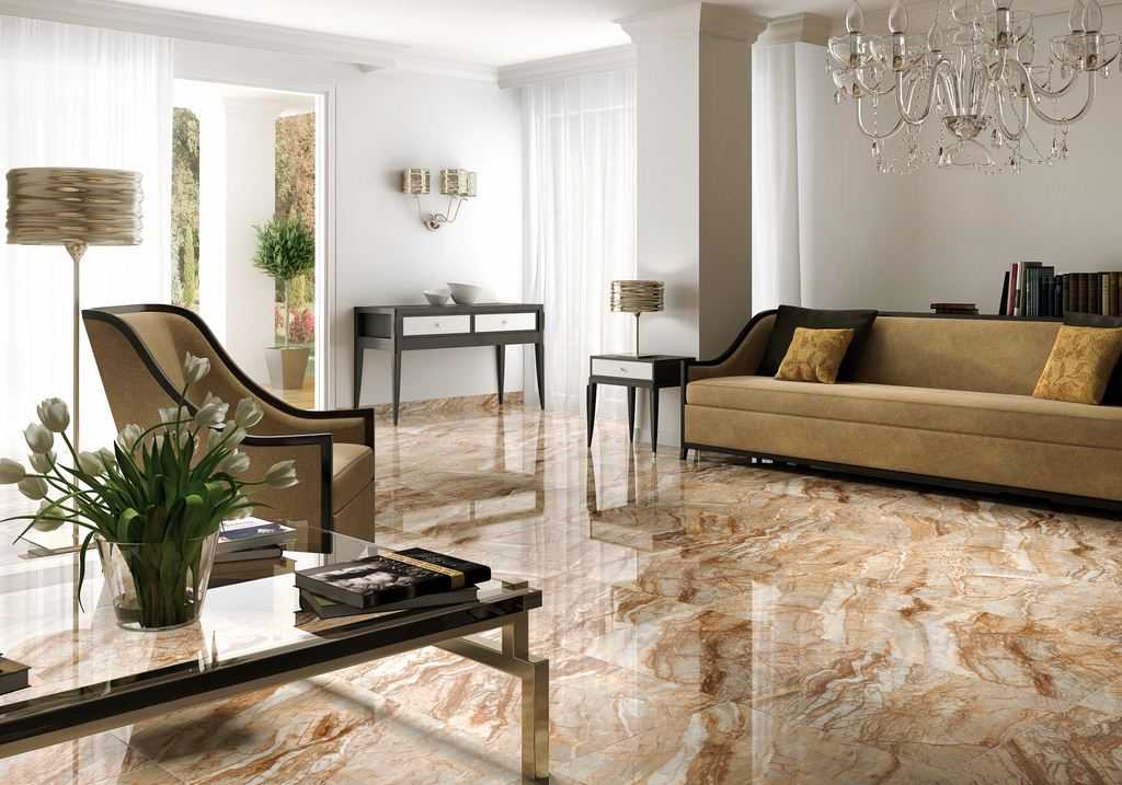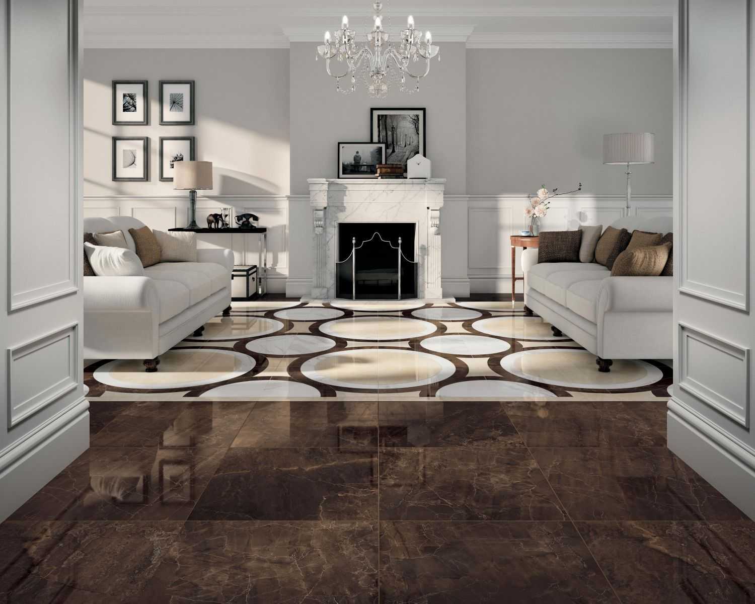 Керамическая плитка — ещё один вариант для решения вопроса покрытия пола. Хоть плитка широкое распространение не получила для оформления гостиных, но все же применима.
