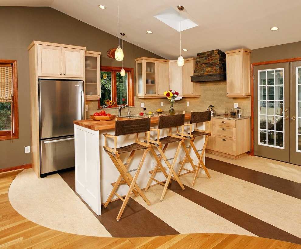 Следует также учитывать, что при выборе напольного покрытия кухни, столовой и обеденной зоны, оно должно быть влагоустройчивым, устойчивым к высоким температурам и легко чиститься. Помимо вышеупомянутой керамической плитки, в отделке часто используют еще терракоту, керамогранит и даже древесину — однако это должен быть сорт высокого качества (предпочтительно лиственница или бук).