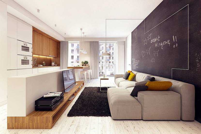 Такой вариант допустим, если в гостиной присутствует фальш-стена или колона. На этих объектах проще сделать черную поверхность. Такая отделка стен гостиной может использоваться для рисования мелками. Каждый день можно изображать что-то необычное и соответствующее настроению.